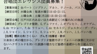 土曜会員も好調スタートしているよ~! 合唱団エレウシスは2019年7月に立ち上げ、2025年1月に第2回演奏会を開催いたしました。現在第3回演奏会を目指して約20名で活動していますが、2025年秋より練習日を拡充し(従来の水曜会員に加えて土...